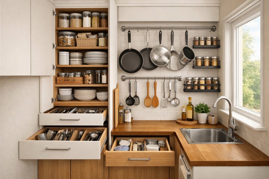 Smart storage tools can help you claim back those awkward or wasted spots in your kitchen. Pull-out systems, fold-down surfaces, and stackable bins all work together to make the most of every inch.