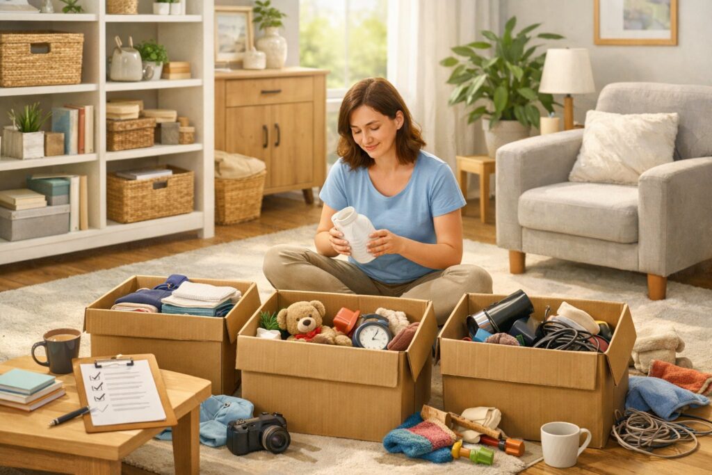 The box method gives every item a clear category. Grab three or four boxes and label them: Keep, Donate, Trash, and maybe Relocate.