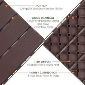 - 【Anti-Slip & Safe】The imitation wood grain texture on the surface of the interlocking floor tiles enhances the friction with your feet, and the grid structure on the bottom enhances friction with the ground, ensuring the deck tiles won't move easily and you won't skid or fall when walking on it. High-traffic areas can also be safely passed without barriers.